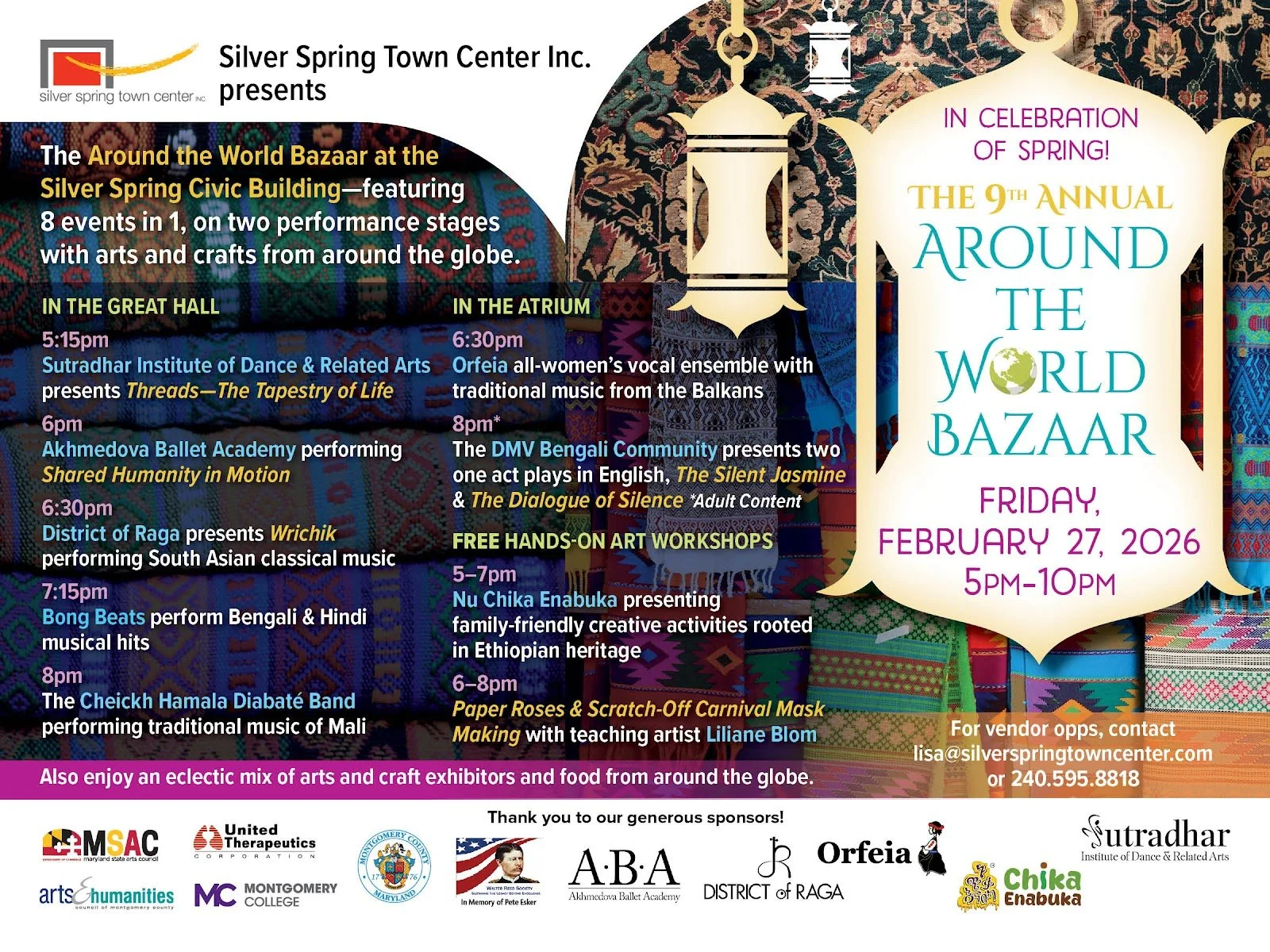 Join us at the Around the World Bazaar at the Silver Spring Civic Center Building, a vibrant celebration of global arts and culture! From 5–10 PM, explore 8 live performances across two stages, enjoy arts and crafts from around the world, and experience music, dance, and creativity for all ages.